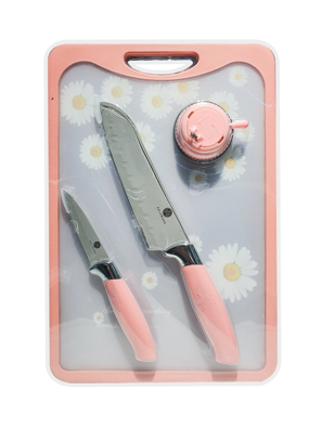 - Cấu tạo: 1 đế gỗ; 1 dao cắt thái lớn 19.5cm; 1 dao cắt đa năng 19.5 cm; 1 dao cắt thịt 19.5cm; 1 dao gọt tỉa 11cm; và 1 dao tỉa 8.5cm (kích thước lưỡi dao).